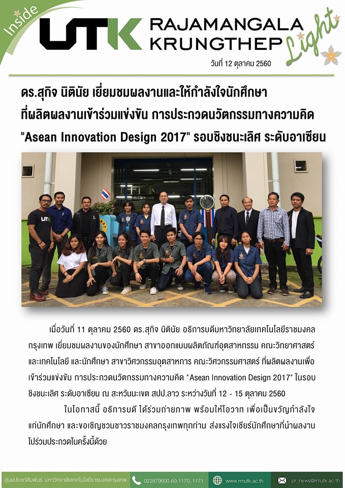 Title: ดร.สุกิจ นิตินัย เยี่ยมชมผลงานและให้กำลังใจนักศึกษาที่ผลิตผลงานเข้าร่วมแข่งขัน การประกวดนวัตกรรมทางความคิด "Asean Innovation Design 2017" รอบชิงชนะเลิศ ระดับอาเซียน