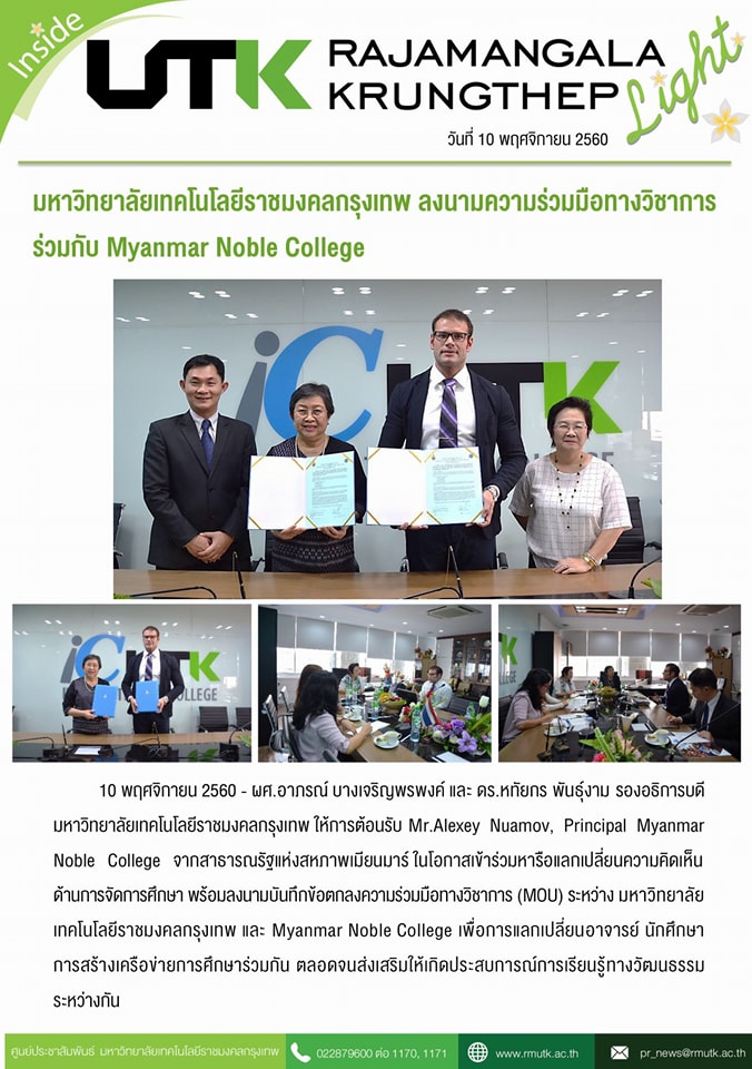 Title: | มหาวิทยาลัยเทคโนโลยีราชมงคลกรุงเทพ ลงนามความร่วมมือทางวิชาการร่วมกับ Myanmar Noble College |