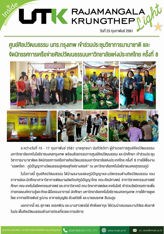 Title: | ศูนย์ศิลปวัฒนธรรม มทร.กรุงเทพ เข้าร่วมประชุมวิชาการนานาชาติ และจัดนิทรรศการเครือข่ายศิลปวัฒนธรรมมหาวิทยาลัยแห่งประเทศไทย ครั้งที่ 8 |