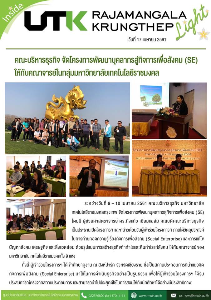Title: | คณะบริหารธุรกิจ จัดโครงการพัฒนาบุคลากรสู่กิจการเพื่อสังคม (SE) ให้กับคณาจารย์ในกลุ่มมหาวิทยาลัยเทคโนโลยีราชมงคล |