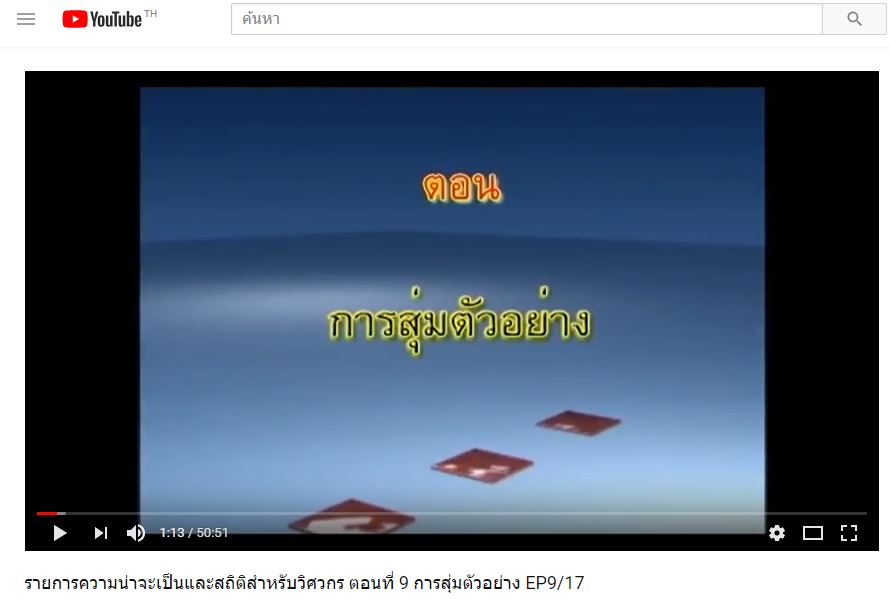 Abstract: โครงการผลิตรายการโทรทัศน์เพื่อการศึกษาทางไกลผ่านดาวเทียม DLTV 15 ออกอากาศทาง สศทท.15 และทางช่อง UBC 200 รายการความน่าจะเป็นและสถิติสำหรับวิศวกร ตอนที่ 9 การสุ่มตัวอย่าง ภาคเรียนที่ 1-2554 โดย อาจารย์ธรรมมา เจียรธราวานิช EP9/17