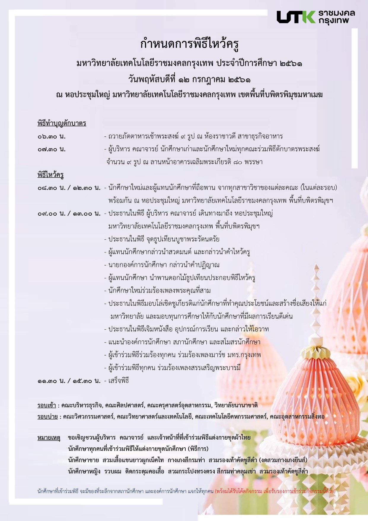 Title: | กำหนดการพิธีไหว้ครู มหาวิทยาลัยเทคโนโลยีราชมงคลกรุงเทพ ประจำปีการศึกษา ๒๕๖๑ |