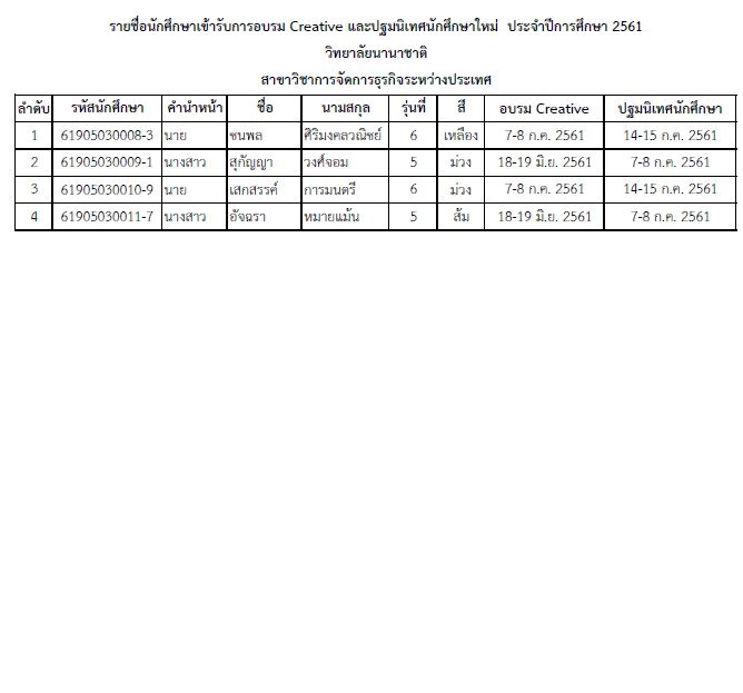 Title: | รายชื่อนักศึกษาวิทยาลัยนานาชาติที่เข้ารับการอบรม Creative Camp และปฐมนิเทศนักศึกษาใหม่ ประจำปีการศึกษา 2561 |