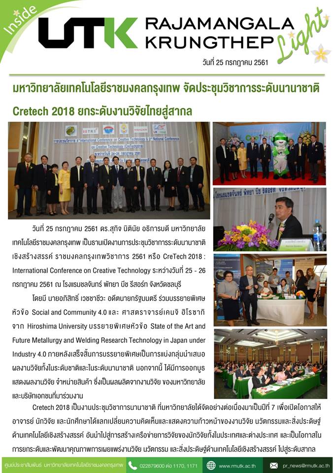 Title: มหาวิทยาลัยเทคโนโลยีราชมงคลกรุงเทพจัดประชุมวิชาการระดับนานาชาติ Cretech 2018 ยกระดับงานวิจัยไทยสู่สากล