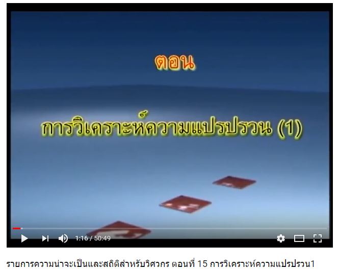 Abstract: โครงการผลิตรายการโทรทัศน์เพื่อการศึกษาทางไกลผ่านดาวเทียม DLTV 15 ออกอากาศทาง สศทท.15 และทางช่อง UBC 200 รายการความน่าจะเป็นและสถิติสำหรับวิศวกร ตอนที่ 15 การวิเคราะห์ความแปรปรวน1 ภาคเรียนที่ 1-2554 โดย อาจารย์ธรรมมา เจียรธราวานิช EP15/17