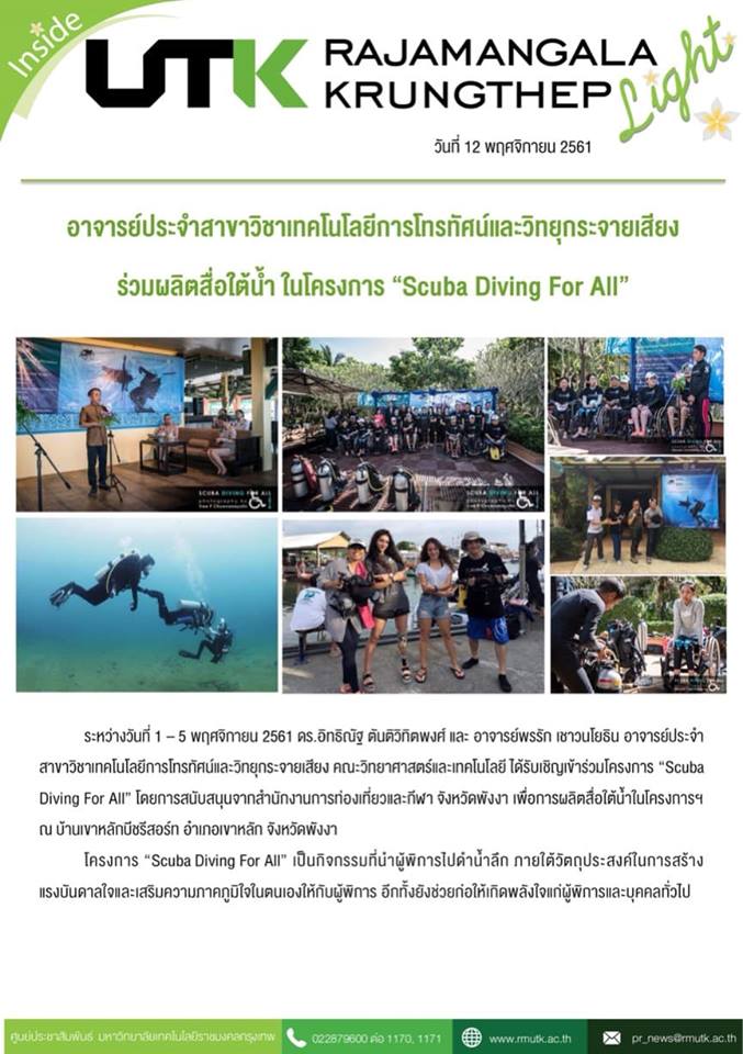 Title: | อาจารย์ประจำสาขาวิชาเทคโนโลยีการโทรทัศน์และวิทยุกระจายเสียง ร่วมผลิตสื่อใต้น้ำ ในโครงการ "Scuba Diving For ALL" |