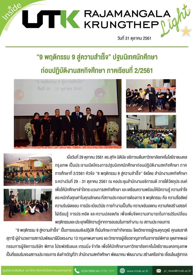 Title: | 9 พฤติกรรม 9 สู่ความสำเร็จ ปฐมนิเทศนักศึกษา ก่อนปฏิบัติงานสหกิจนักศึกษา ภาคเรียนที่ 2/2561 |