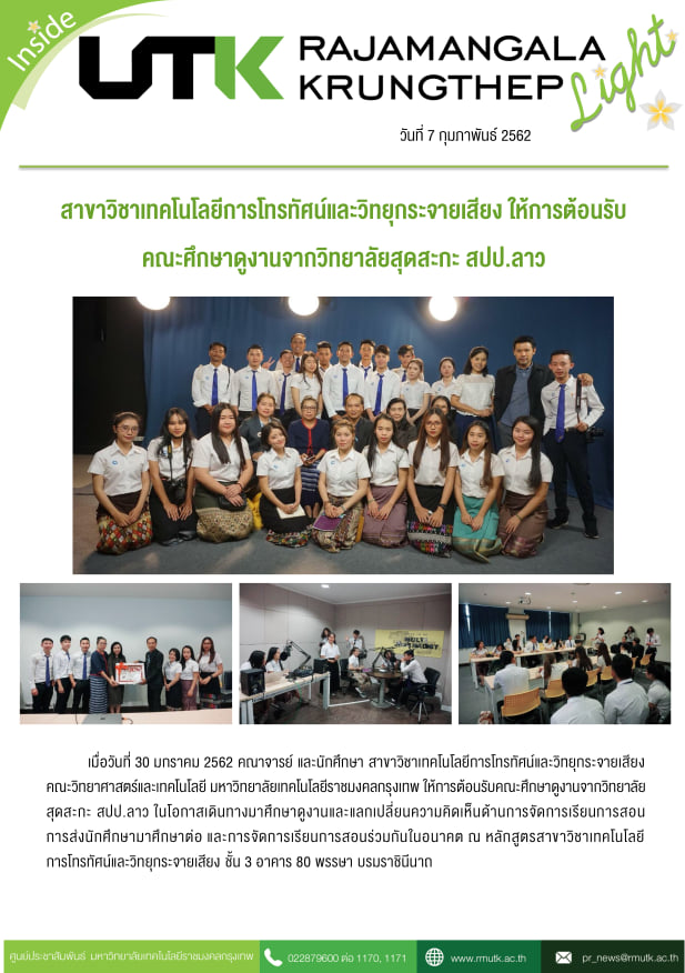 Title: | สาขาวิชาเทคโนโลยีการโทรทัศน์และวิทยุกระจายเสียง ให้การต้อนรับ คณะศึกษาดูงานจากวิทยาลัยสุดสะกะ สปป.ลาว |