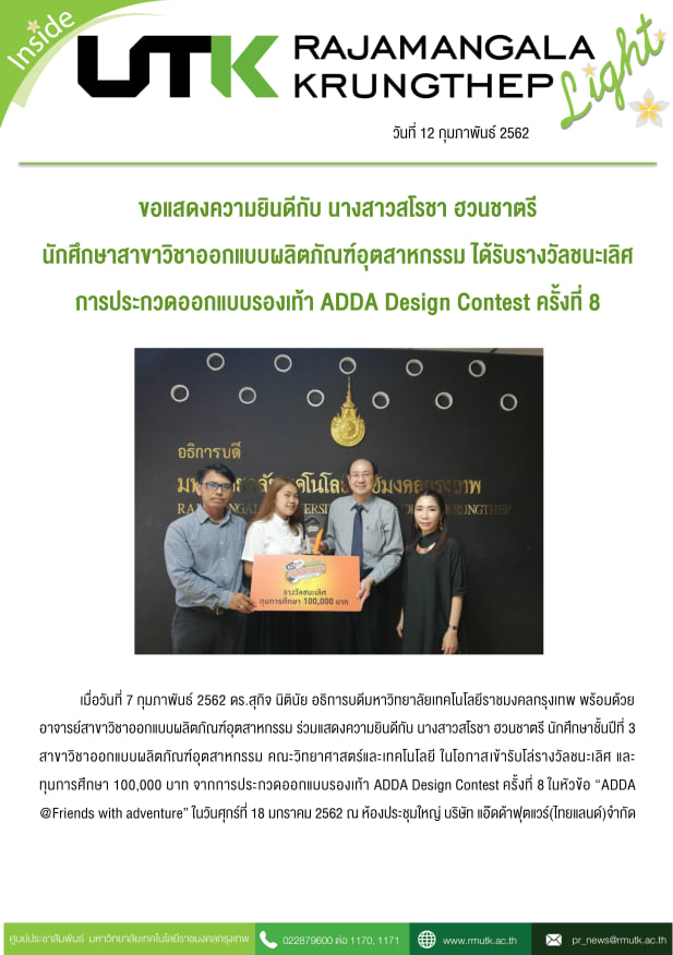 Title: | ขอแสดงความยินดีกับนางสาวสโรชา ฮวนชาตรี นักศึกษาสาขาวิชาออกแบบผลิตภัณฑ์อุตสาหกรรม ได้รับรางวัลชนะเลิศการประกวดออกแบบรองเท้า ADDA Design Contest ครั้งที่ 8 |