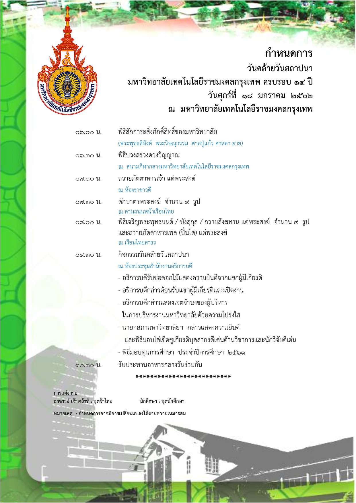 Title: กำหนดการ วันคล้ายวันสถาปนามหาวิทยาลัยเทคโนโลยีราชมงคลกรุงเทพ ครบรอบ ๑๔ ปี
