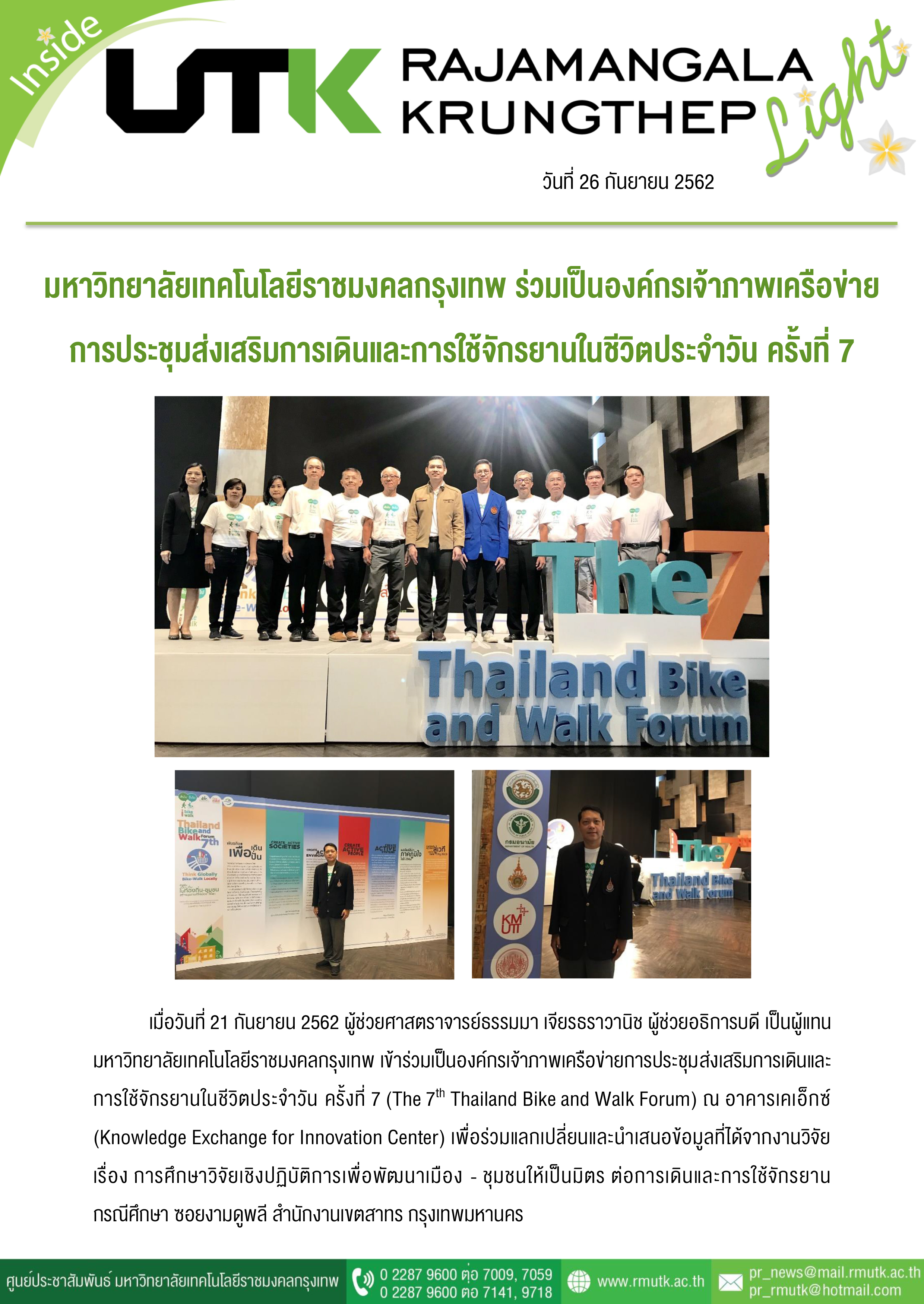 Title: | มหาวิทยาลัยเทคโนโลยีราชมงคลกรุงเทพ ร่วมเป็นองค์กรเจ้าภาพเครือข่าย การประชุมส่งเสริมการเดินและการใช้จักรยานในชีวิตประจำวัน ครั้งที่ 7 |