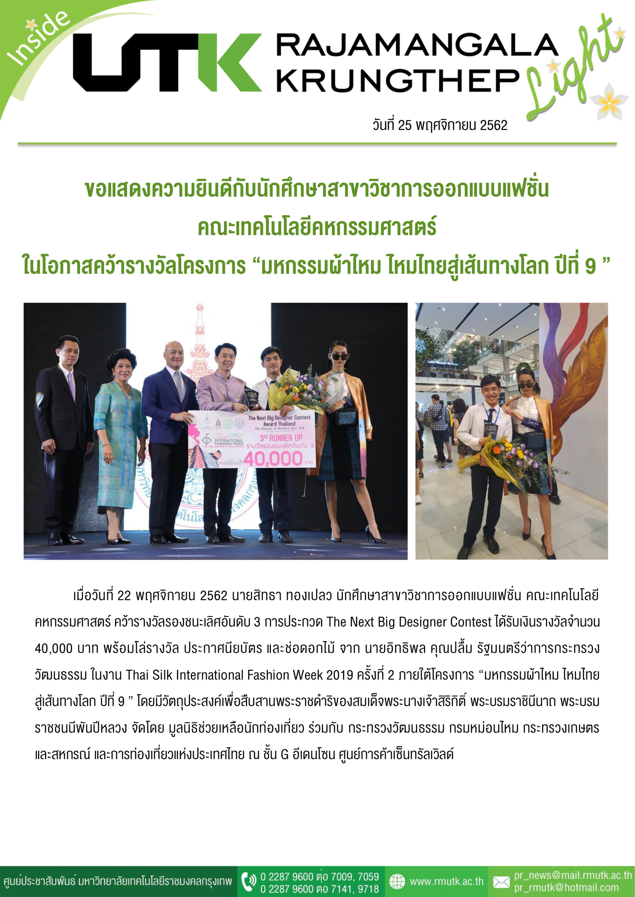 Title: | ขอแสดงความยินดีกับนักศึกษาสาขาวิชาการออกแบบแฟชั่น คว้ารางวัลโครงการ มหกรรมผ้าไหม ไหมไทยสู่เส้นทางโลก ปีที่ 9 |