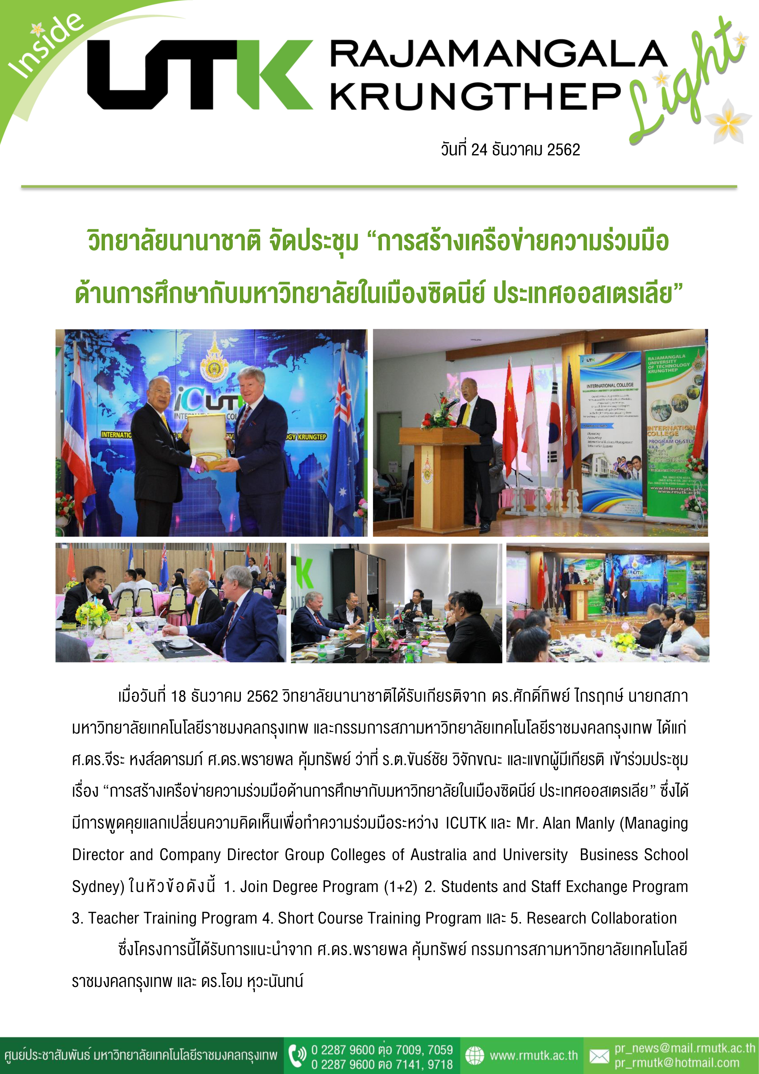 Title: | วิทยาลัยนานาชาติ จัดประชุม การสร้างเครือข่ายความร่วมมือด้านการศึกษากับมหาวิทยาลัยในเมืองซิดนีย์ ประเทศออสเตรเลีย |