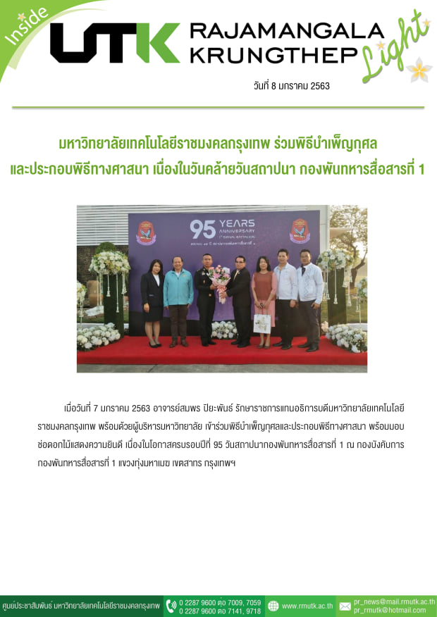 Title: | มหาวิทยาลัยเทคโนโลยีราชมงคลกรุงเทพร่วมพิธีบำเพ็ญกุศลและประกอบพิธีทางศาสนา เนื่องในวันคล้ายวันสถาปนา กองกันทหารสื่อสารที่ 1 |