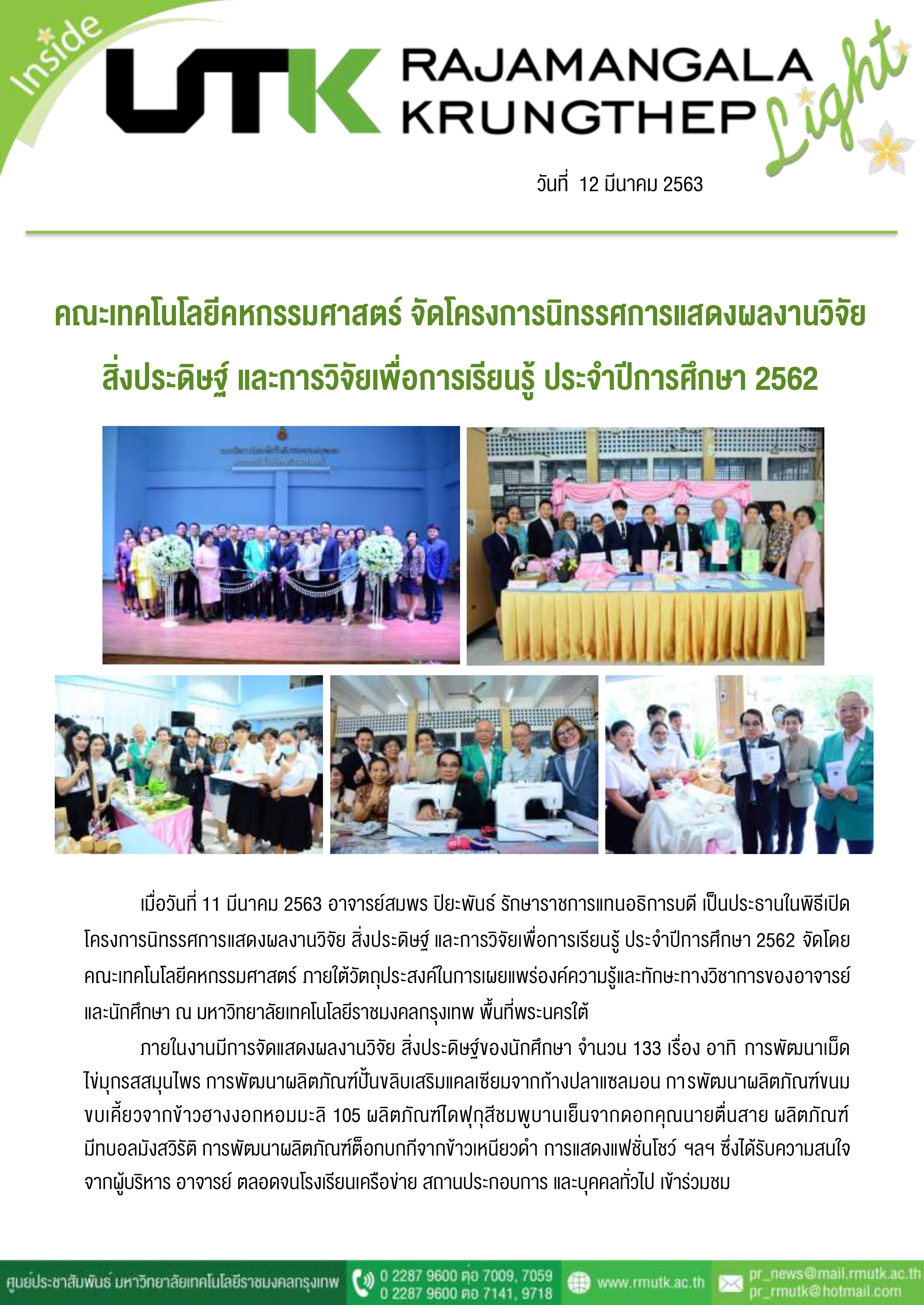 Title: | คณะเทคโนโลยีคหกรรมศาสตร์ จัดโครงการนิทรรศการแสดงผลงานวิจัยสิ่งประดิษฐ์ และการวิจัยเพื่อการเรียนรู ประจำปีการศึกษา 2562 |