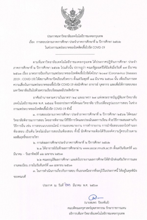 Title: ประกาศมหาวิทยาลัยเทคโนโลยีราชมงคลกรุงเทพ เรื่อง การสอบปลายภาคการศึกษา ประจำภาคการศึกษาที่ 2 ปีการศึกษา 2562 ในช่วงการแพร่ระบาดของโรคติดเชื้อไวรัส Covid-19