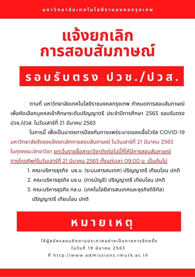 Title: | ประกาศมหาวิทยาลัยเทคโนโลยีราชมงคลกรุงเทพ เรื่อง ยกเลิกกำหนดการสอบสัมภาษณ์คัดเลือกบุคคลเพื่อเข้าศึกษาระดับปริญญาตรี ประจำปีการศึกษา 2563 รอบรับตรง ปวช./ปวส. |